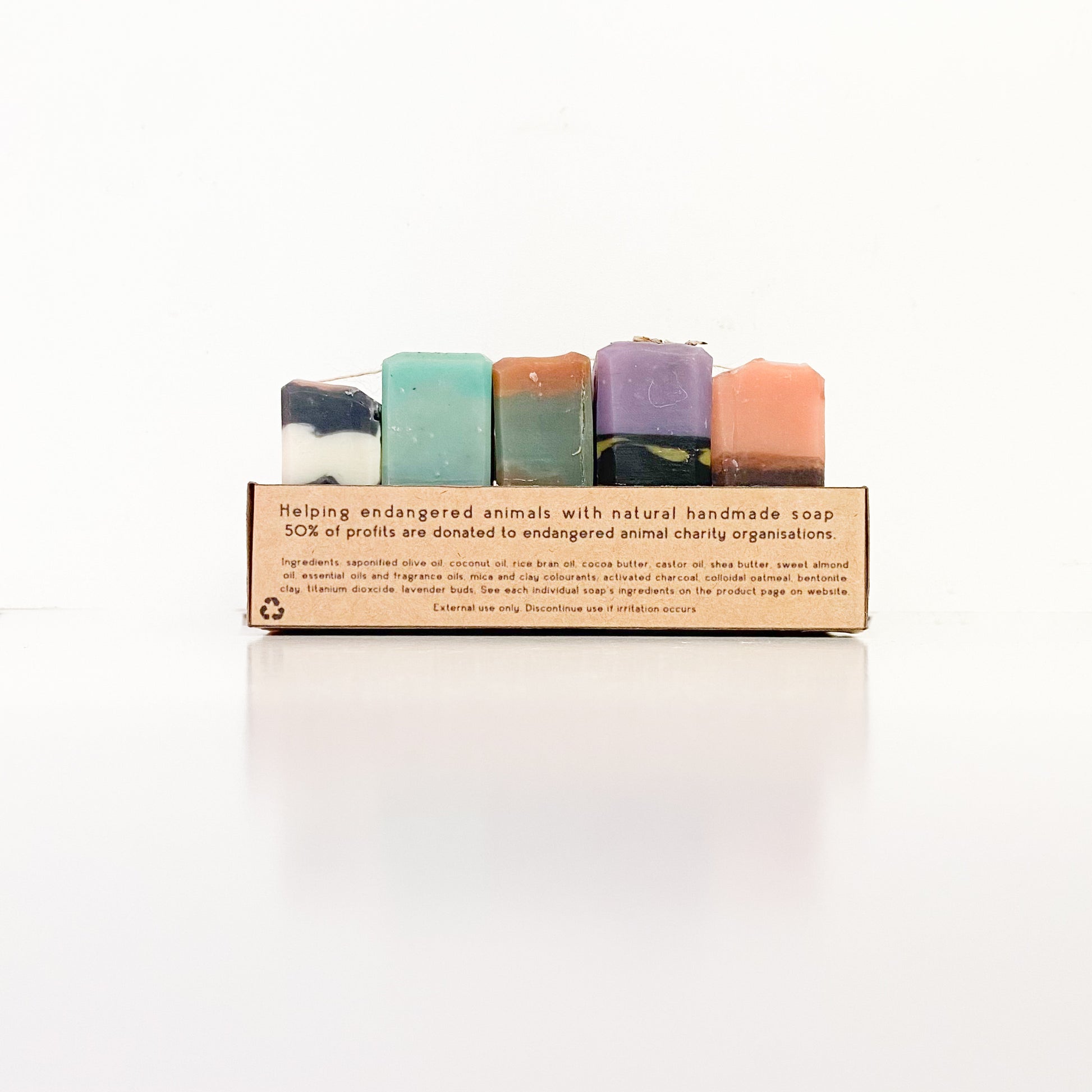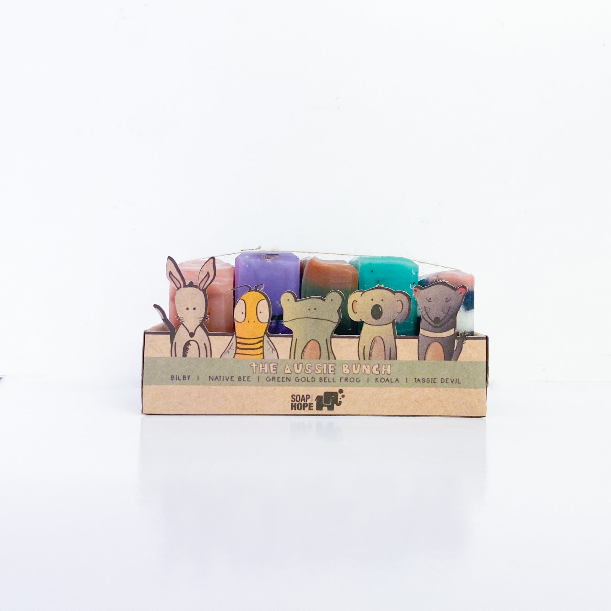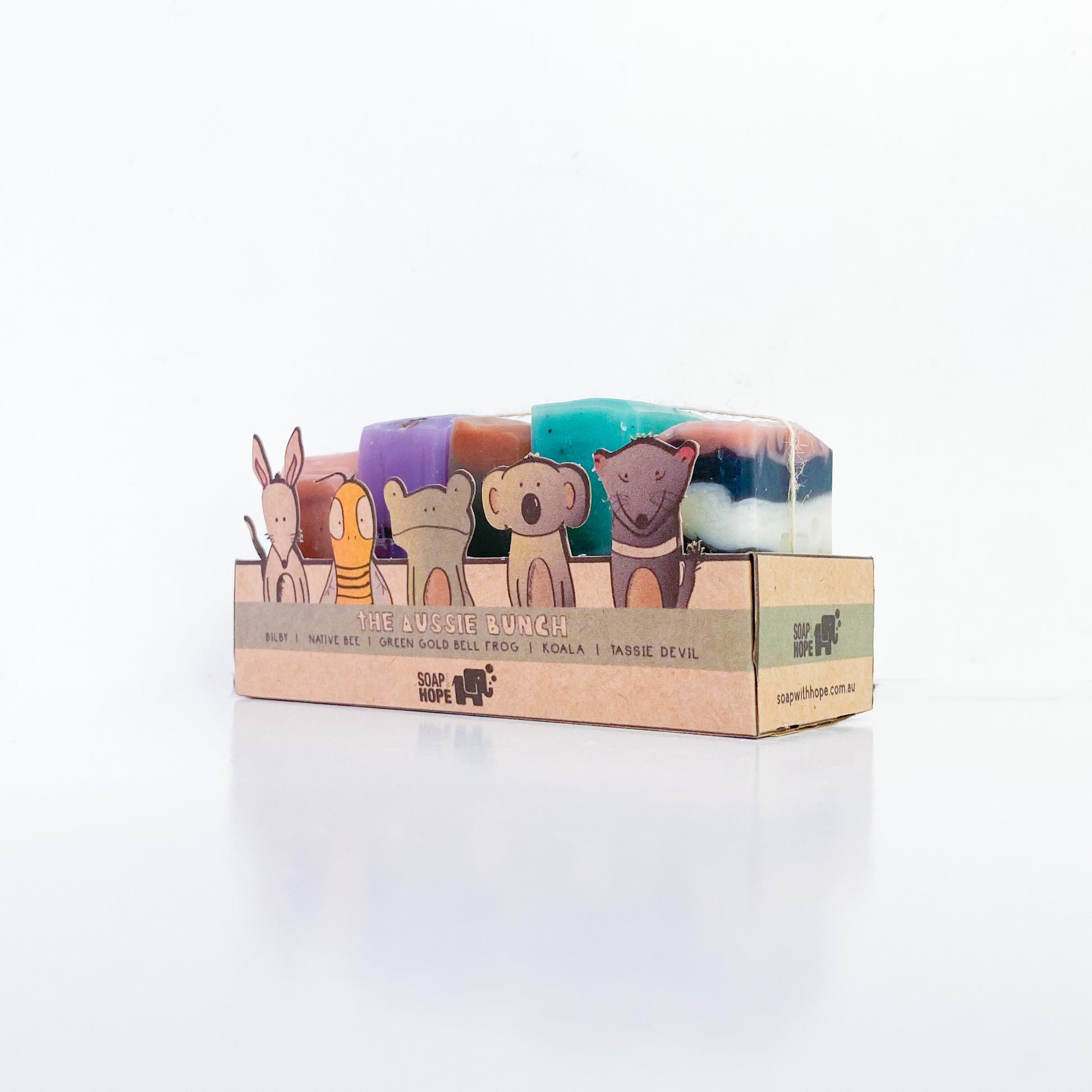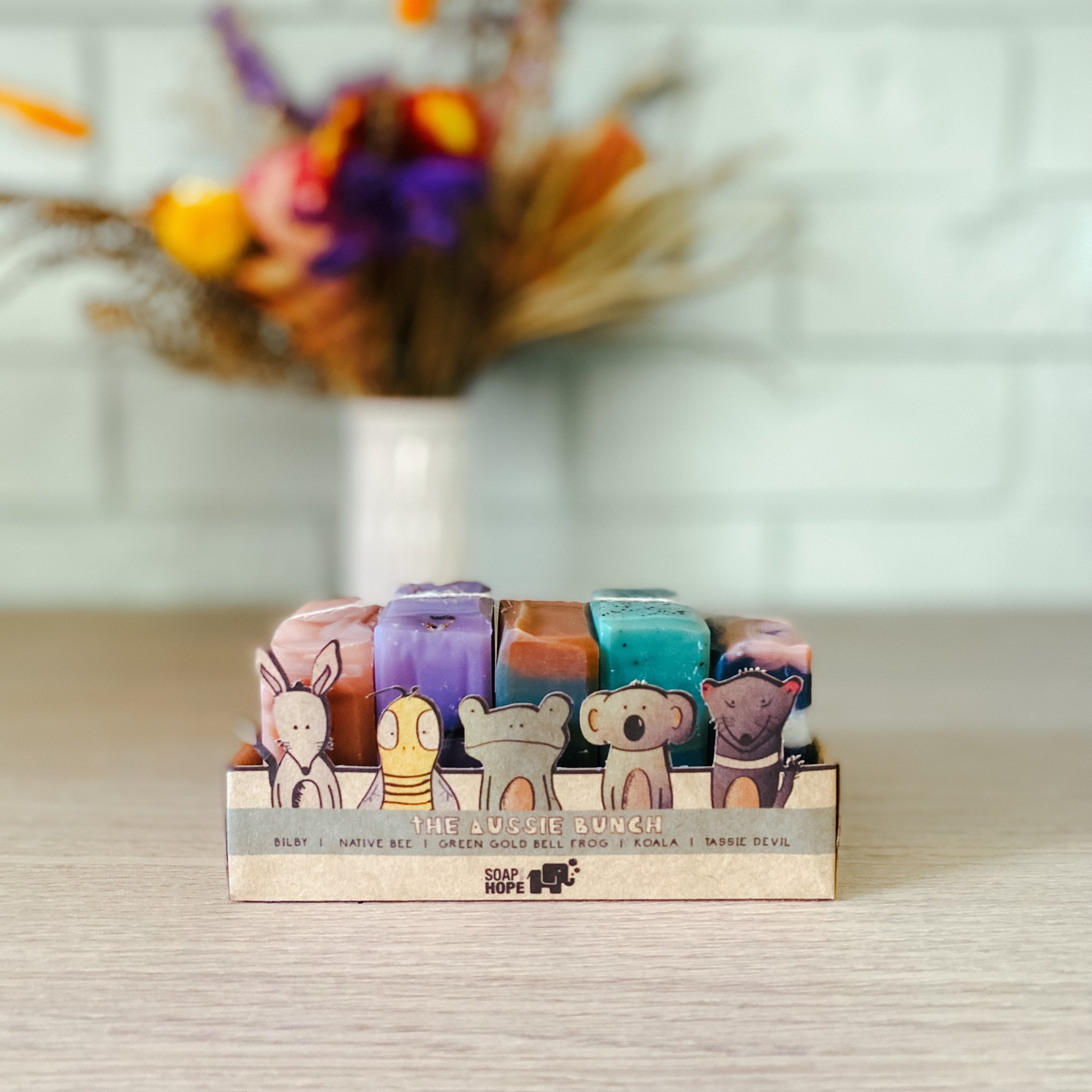 These packs make a great gift, or even just for yourself to try each Aussie soap. They come with 5 x 60g bars (half size of full sized bars), including the Greater Bilby Bar, Green Golden Bell Frog Bar, Tassie Devil Bar, Koala Bar and the Native Bee Bar. Proceeds from each gift pack is donated between each Australian animal organisation. Visit each individual soap page to read about each one.