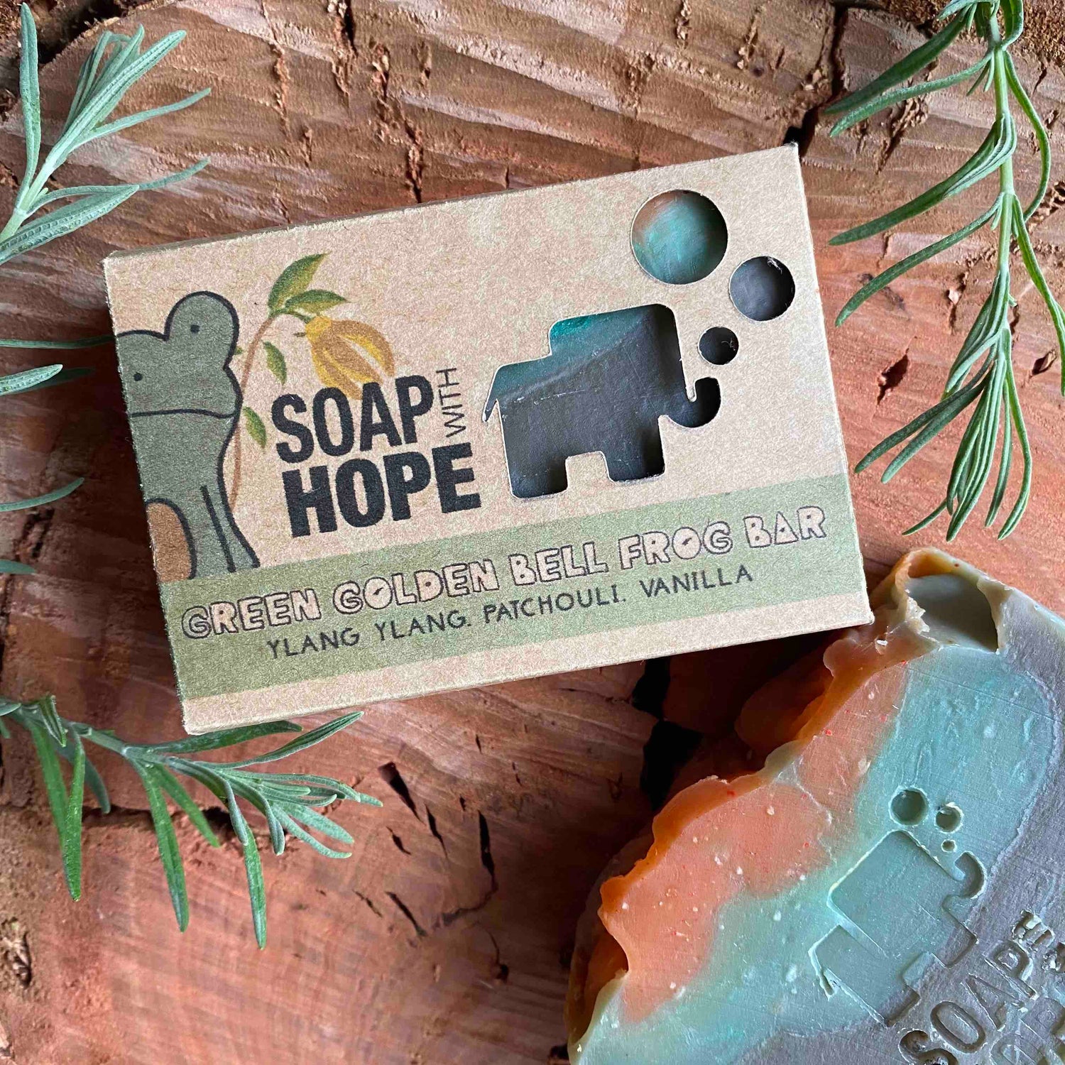 Pair the Green Golden Bell Frog Bar with a travel soap pouch or wooden soap dish, perfect to keep your bar long-lasting.